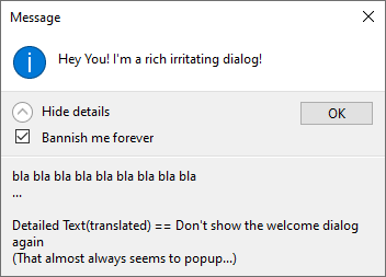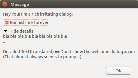 This class adds the possibility of using a checkbox (that is especially useful for implementing the “Don’t ask me again” kind of dialogs) and an extra explanatory text which is initially collapsed and not shown to the user but can be expanded to show more information.